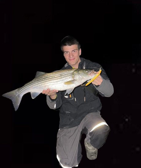 Alex with lovely striper that took a Bomber Long A. Monday evening off a Patuxent pier.