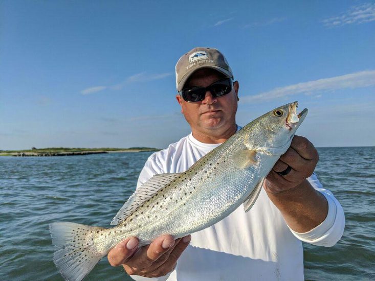 First Image: Michael Jordan leads the Tackle Box big perch contest for June with this 13 inch beauty. Second Image: Fine striper caught on rocky shoreline just north of the Solomons Boat Ramp on a Hard Head Custom Bait popping rig. Third Image: Mike Jordan with speckled trout from salt islands, west of Tangier.