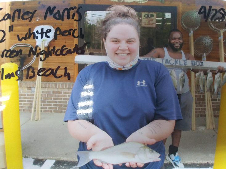 Carley Norris won the monthly big perch contest for April with this 12 incher from Elms Beach on the bay near Spring Ridge, Md.