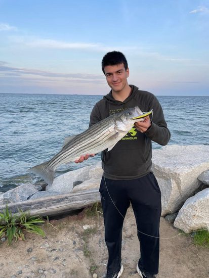 Champion shore fisherman, Alex, shows a fine striper from the bay shore, Cedar Point Hollow.