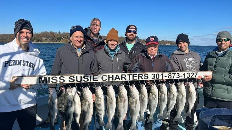 Capt. Greg is finding huge schools of rockfish daily in the bay from Second Beach to the Chinese Muds at the mouth of the Patuxent.