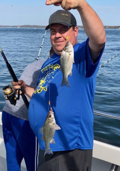 Trollers of bucktails and paddle tail jigs in tandems will find plenty of action in the breakers. Lure casters and jiggers can drift into the action and have lots of fun on light tackle.
